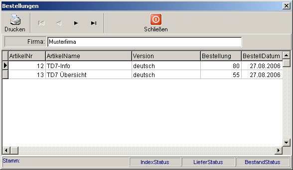 Die Bestell-Liste zeigt die aktuell vorliegenden Bestellungen aller Artikel, sortiert nach Lieferanten. Sie wird von der Bestands-Verwaltung aus angezeigt.